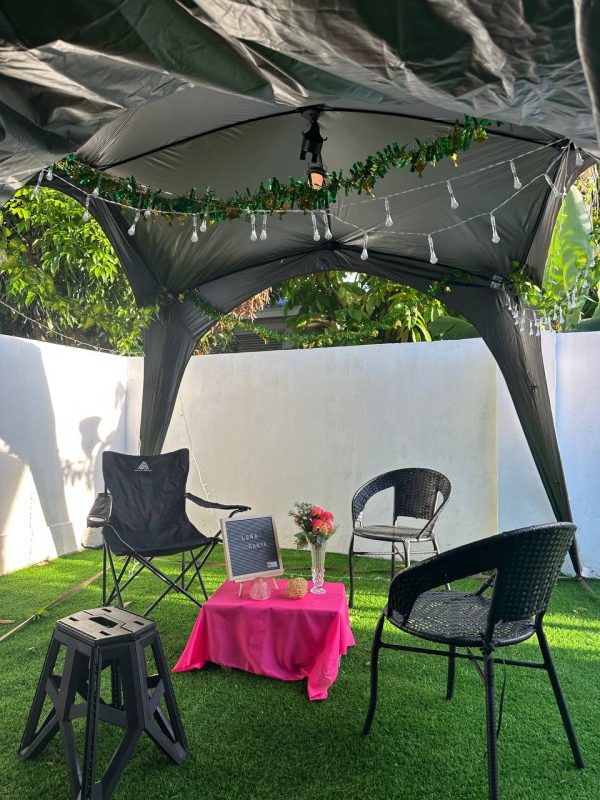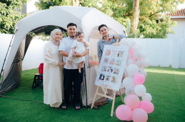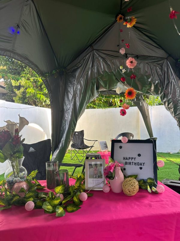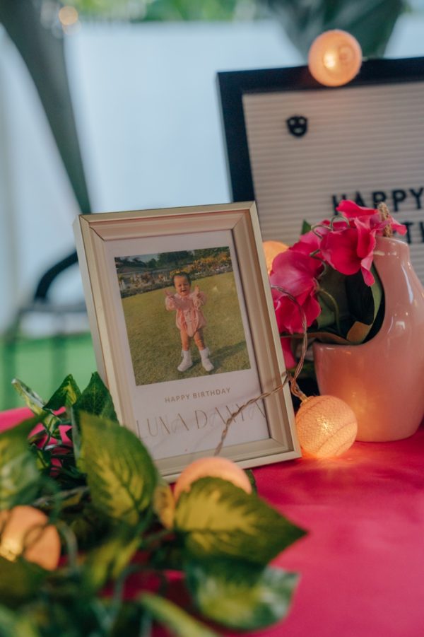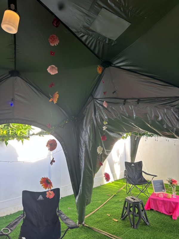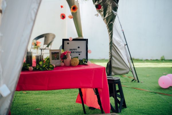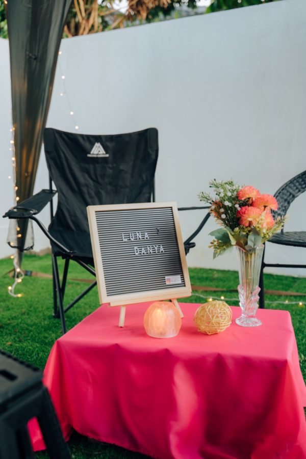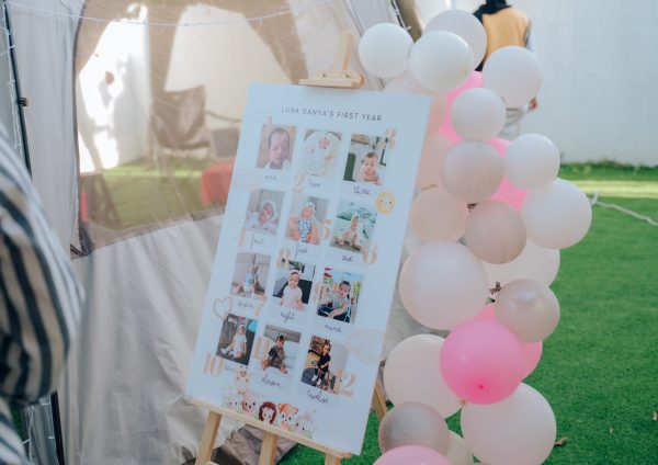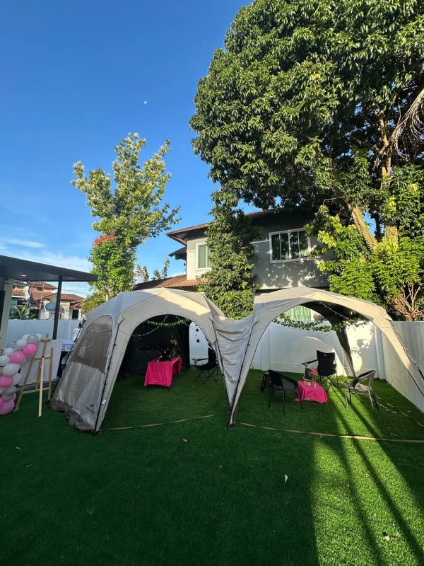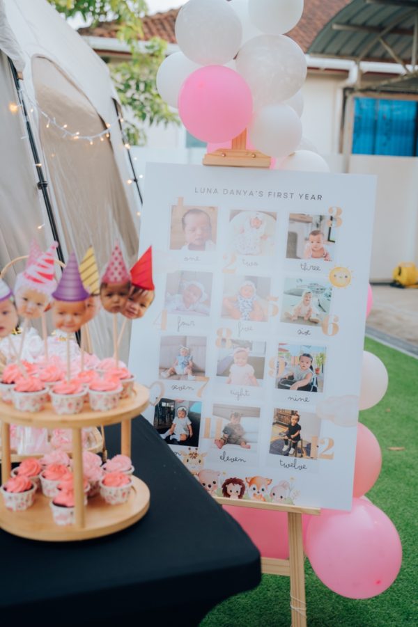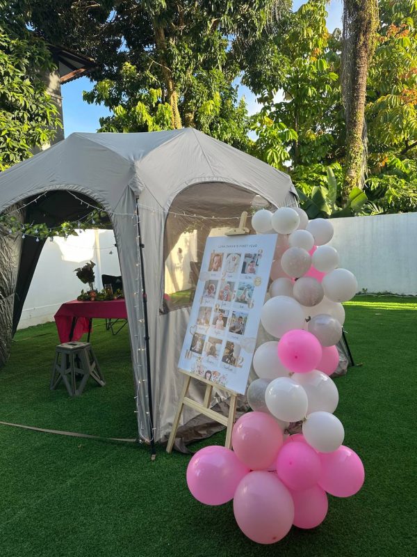 A glamping dome decorated specially for Luna Danya’s 1st Year Birthday Party. Alongside the purchase of Package G from our Tent Packages, which includes Dome A, Dome B, and Simple Decorations, our client has also purchased multiple additional decoration elements, including balloons, a poster stand, and a picture frame. Plus, our client has also requested that our team set up the whole party setting in their backyard.
