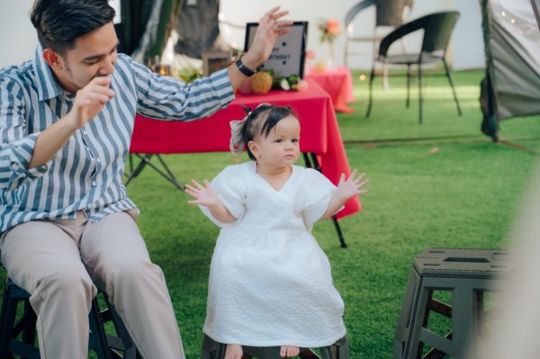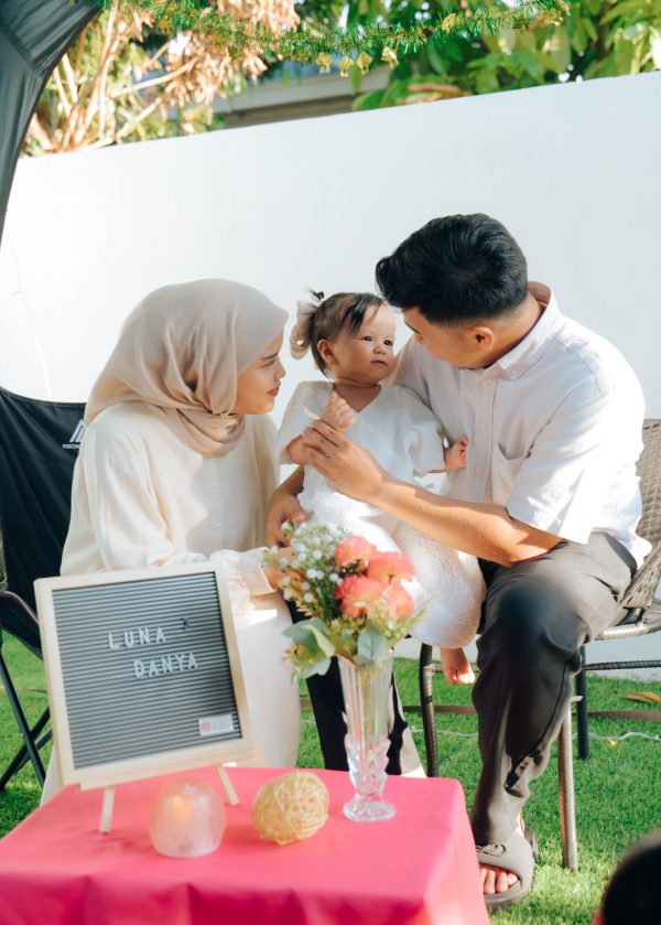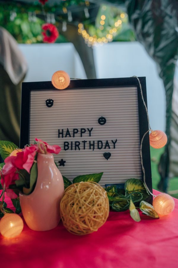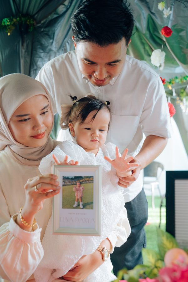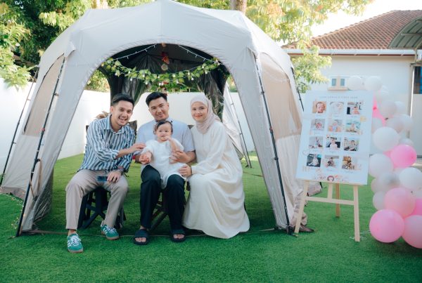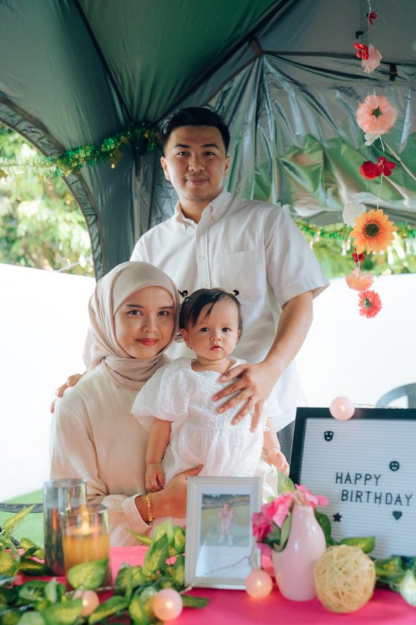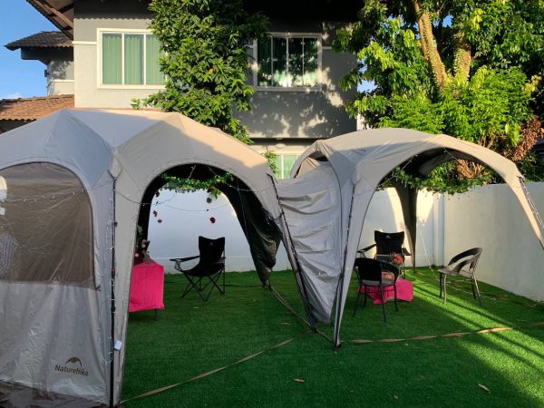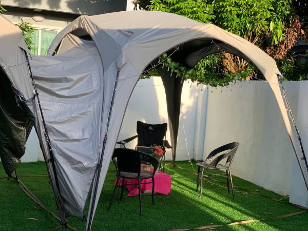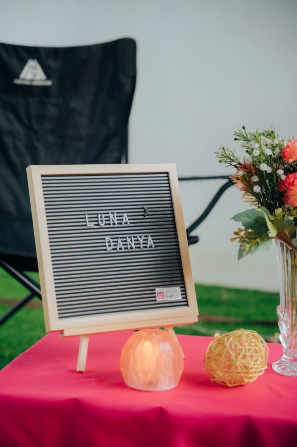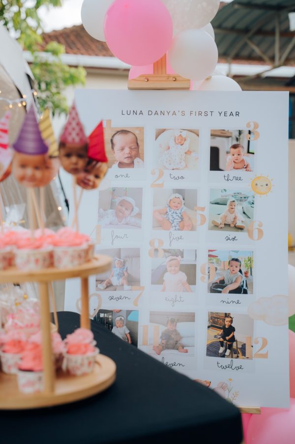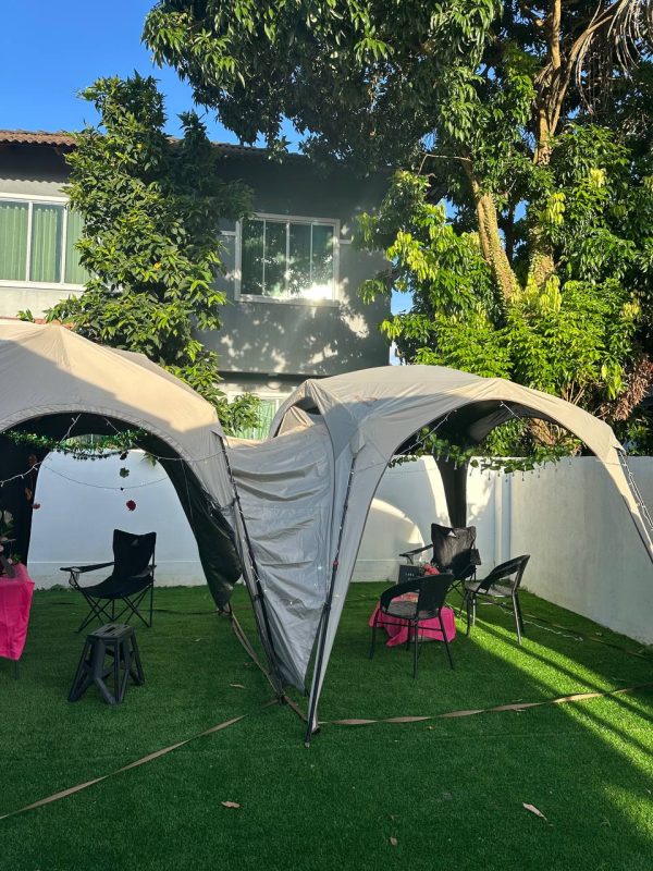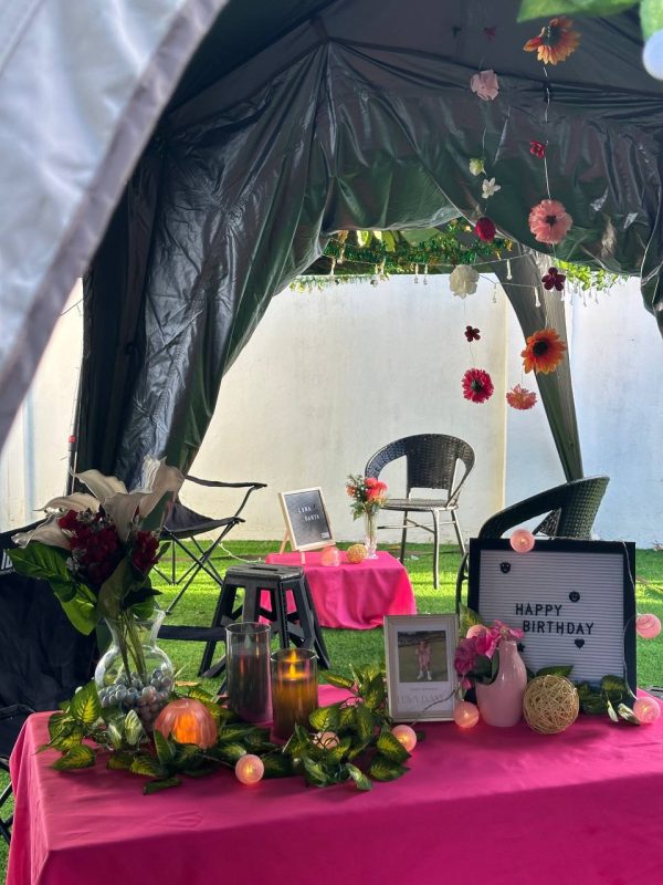 A glamping dome decorated specially for Luna Danya’s 1st Year Birthday Party. Alongside the purchase of Package G from our Tent Packages, which includes Dome A, Dome B, and Simple Decorations, our client has also purchased multiple additional decoration elements, including balloons, a poster stand, and a picture frame. Plus, our client has also requested that our team set up the whole party setting in their backyard.